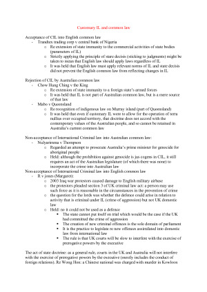 These are great detailed notes for a pretty complicated class. Very readable with highlighting for cases and legislation. Topics: UN, custom as a source of IL, treaty interpretation, customary IL and common law, treaties, statehood, self-determination, international responsibility, standard of treatment of foreign nationals, expropriation of property, nationality rule, jurisdiction, prohibition on violence, ICJ, war law, self-defence, international crimes