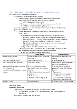 Notes based on the material from all online lectures, workshops, class discussions and activities and readings. Topics include: - What is Corporate Governance? - Corporate Governance Theories (stakeholder, agency, stewardship, etc.) - Models of Corporate Governance (insider vs. outsider) - Operations of the Board - Audit and the Role of the Audit Committee - Managing and Reporting Risk - Remuneration and Accountability - Reporting Corporate Performance: Financial Reporting - Corporate Social Responsibility (CSR) and the Interests of Stakeholders - Ethics and Corporate Governance - Future Directions in Corporate Governance These notes helped me do extremely well and so would highly recommend them!!