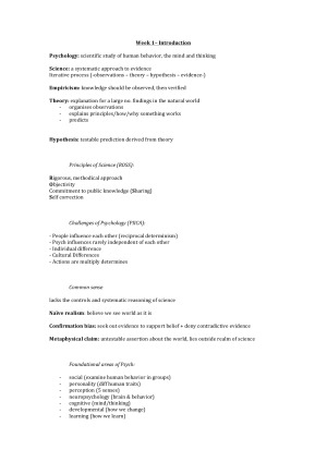 'Introduction to Psychology' notes for the Final Exam. Formerly PSYU1104. Includes all lecture and reading content (integrated). Topics: Intro, theoretical frameworks, motivation, learning, personality, aggression and violence, psychopathology. This summary is condensed but doesn't skip on detail. It is mostly text but has images where I believe they are more useful (not included on the sample notes). These notes use spaced subheadings so you can test your recall!!! This is the best way to study for the exam. Simply use your hand or a piece of paper to cover the notes except the sub-heading and see if you can recall the information. This is the same concept as flashcards. If you prefer a super condensed note-style I suggest you read use this as your 'master document' and create your own 1-2 page mind map (based on these notes) for each topic.