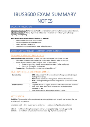 Concise exam summary notes created for IBUS3600 in Semester 2, 2020. Summary of ALL key information needed to ace the final exam! Huge time saver, as these condensed notes include all exam relevant content, but less than half of the total course material. Perfect for exam revision. HD Exam Standard Notes. Includes content from all weeks, excluding Week 2: 1. Introduction and Course Overview 3. Motivation & Leadership across cultures 4. Expanding Abroad and the Entry Mode 5. Understanding the International Context: Responding to Conflicting Environmental Forces 6. Trade Policy in Developing Countries 7. Managing and Governing around the world 8. Organisation Structure in MNEs 9. External Economies of Scale and the International Location of Production 10. Implementing the Strategy: Building Multidimensional Capabilities 11. Internationalization Entrepreneurship and SMES 12. Unit Review