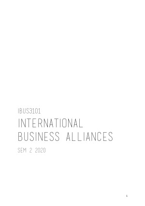 Perfectly formatted summary of the entire IBUS3101 International Business Alliances Course. Detailed Table of Contents to make finding what you need easy! Also includes ALL Readings from Weeks 1-8 (needed for the Mid Sem Exam). Plus an approx 10 page detailed summary of all key case studies with the course concepts applied (I created these myself, not overly discussed in class). HD Exam Standard Notes. Text in red also indicates points flagged as important for the final exam. Topics covered include: Week 1: Introduction and Unit Overview Week 2: Theoretical Perspectives Week 3: Rationale and Partner Selection Week 4: Alliance Design Part One Week 5: Alliance Design Part Two Week 6: Alliance Management Challenges Part One Week 7: Alliance Management Challenges Part Two Week 8: Relationship Management Week 9: Alliance Evaluation/Performance Week 10: Managing Alliance Risks Week 12: Building Alliance Capability & Exam Information