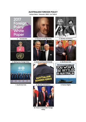 - Full comprehensive notes on POLS2201 for all weeks - Title page with page numbers to find relevant topics - Each topic also has its own "contents box" to find specific information - Notes from lecturer, textbook, and weekly readings are colour-coded and easily distinguishable Topics Include: 1. Introduction to Australian Foreign Policy 2. Theories of Foreign Policy 3. Identity, Traditions, and History 4. Making of Australian Foreign Policy 5. North-East Asia 6. South-East Asia 7. Security and Defence 8. Human Rights 9. Future of Australian Foreign Policy 10. Reading Notes