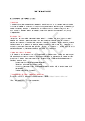 Case Summaries (including short facts, judgements and what was considered) for the following topics: Restraint of Trade, 'Trading' Corporations, Misuse of Market Power, Substantially Lessening of Competition Test Anti Competitive Agreements, Cartel Conduct (including cases on possible counter arguments: public interest, safety and countervailing power) Price Fixing, Exclusionary Provisions/Boycotts, Misuse of Market Power, Exclusive Dealing (tying, suppliers refusal to deal, third line forcing, notification), Resale Price Maintenance, Cases which define: 'competition' 'contracts' 'agreements' 'understandings.' I use these to glance at when I am doing problem questions. Very handy!