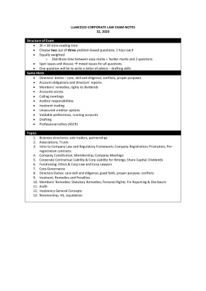 These notes are for the new LLAW2323 Corporate Law topic. I obtained a distinction in the topic overall, with my assignment being shortlisted for the JWS Prize. These notes contained all the detail you need to answer Corp Law exam question, and include references to the Corp Legislation as well as case law. These notes include: 1. Business structures: sole traders, partnerships 2. Associations, Trusts 3. Intro to Company Law and Regulatory Framework; Company Registration; Promotors; Pre-registration contracts 4. Company Constitution; Membership; Company Meetings 5. Corporate Contractual Liability & Corp Liability for Wrongs; Share Capital; Dividends 6. Fundraising; Ethics & Corp Law and Corp Lawyers 7. Corp Governance 8. Directors Duties: care skill and diligence; good faith, proper purpose; conflicts 9. Insolvent; Remedies and Penalties 10. Members’ Remedies: Statutory Remedies; Personal Rights; Fin Reporting & Disclosure 11. Audit 12. Insolvency General Concepts 13. Receivership, VA, Liquidation
