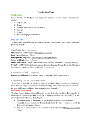 Long form revision notes for torts, covering all readings, authorities and principles. Topics include: - Private nuisance - Negligence - Duty of care - Breach - Causation - Contributory negligence - Voluntary assumption of risk - Vicarious liability - Multiple wrongdoers