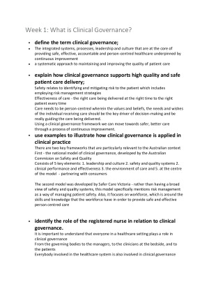 Notes for learning outcomes for all weeks, 1-7 Week 1: What is Clinical Governance? Week 2: Clinical Risk Management Week 3: Partnering with Consumers Week 4: Clinical Practice - Scope and Evidence Week 5: Leadership and culture Week 6: Workforce - CPD and delegation Week 7: Improving care