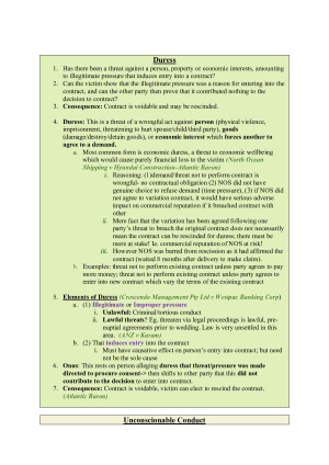 You literally wont need anything else for your exam except this condensed exam scaffold. It tells you how you need to structure your answer for each topic, which cases/legislation you need to integrate into the answer and give you the exact wording you should use when making arguments. Covers all the topics in Torts/Contracts 2. This made me get a HD for my exam :) Check out my other scaffold notes! Topics include 1: Damages, Causation, Remoteness 2: Damages: Measure of damages in contract, sums fixed by contract (law of penalties included) 3: Vitiating factors; rescission; duress and mistake 4: Undue influence, unconscionable conduct, unfair contract terms 5: Misrepresentation, misleading/deceptive conduct 6: Trespass to land, damage to aircraft 7: Private nuisance; interference with goods 8: PEL (I, II, III), negligent misstatement, tort of deceit - Pure economic loss (PEL), Property damage compared to PEL, Liability for PEL from defective structures/products, damage to third party's property, 9: Multiple wrongdoers: proportionate liability