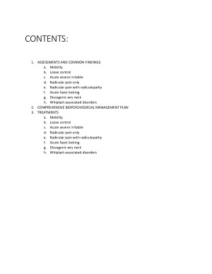 The history of Presenting complaint of each condition The relevant assessments and their findings Treatment pathways and examples of exercises to use in each stage The Biopsychosocial approach. a. Mobility b. Loose control c. Acute severe irritable d. Radicular pain only e. Radicular pain with radiculopathy f. Acute facet locking g. Discogenic wry neck h. Whiplash associated disorders