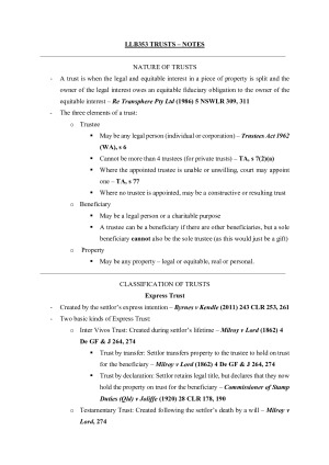 Comprehensive exam notes for LLB353 Trusts at Murdoch University. Topics include: - Nature of Trusts - Classification of Trusts - Express Trusts (Including Certainty of Intention, Subject Matter and Object, Formal Requirements, Complete Constitution, Vitiating Factors and Charitable Trusts) - Rights of Beneficiaries - Appointment, Removal, Rights and Duties of Trustees - Breach of Trust - Tracing - Resulting Trusts - Constructive Trusts