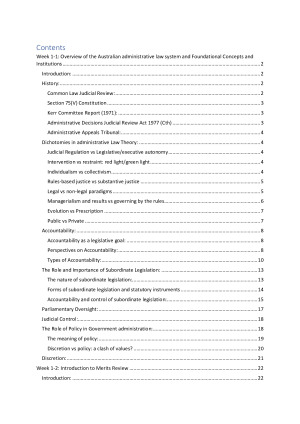 Topics Covered (10 Weeks): - Overview of the Australian administrative law system and Foundational Concepts and Institutions - Introduction to Merits Review - Merits Review: the tribunal’s role, process and remedies - The Scope of Judicial Review - Standing - Reasons for Administrative Decisions - Judicial Grounds Of Review - Acting Without Power - Fact-Finding Error - Delegation - Statutory Interpretation - Procedural Fairness: The Hearing Rule and the rule Against Bias - Relevant and Irrelevant Considerations - Unlawful use of Policies - Unreasonableness - Jurisdictional Error - Remedies - Statutory Restrictions