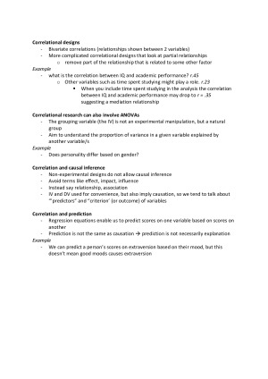 These are my subject notes which cover each lecture topic presented throughout the semester in detail. These include: - Module 1: Introduction to correlation design and survey methods - Module 2: Bivariate correlation, regression and scale construction - Module 3: Reliability analysis - Module 4: Factor analysis (part 1) - Module 5: Factor analysis (part 2) - Module 6: One way chi-square - Module 7: Two way chi-square - Module 8: Standard multiple regression - Module 9: Factorial between groups ANOVA (part 1) - Module 10: Factorial between groups ANOVA (part 2 and 3) - Module 11: Factorial mixed and repeated measures ANOVA (part 1) - Module 12: Factorial mixed and repeated measures ANOVA (part 2) Each lecture module has been broken down into comprehensible dot points which makes the content easier to understand and build upon. Please note that these notes do not contain any exam/assignment information, such as quizzes, practice questions, hints, ect. They are purely lecture summaries.
