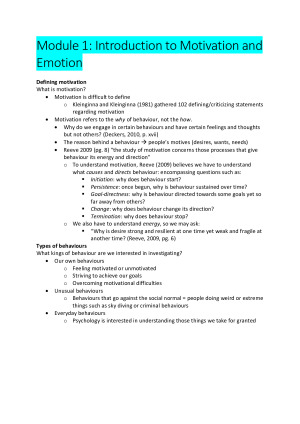 These are my subject notes which cover each lecture topic presented throughout the semester in detail. These include: - Module 1: Introduction to Motivation - Module 2: The Role of Evolution: Natural and Sexual Selection - Module 3: Nature and Nurture - Module 4: Changing Motivated Behaviour: Learning and ABA - Module 5: Sensory Sensations and Consciousness - Module 6: Drives and Arousal Mechanisms - Module 7: Basic Emotions: Natural Kinds? - Module 8: Basic Emotions: The Emotional Process - Module 10: Specific Basic Emotions - Module 11: The Social Emotions - Module 12: Decisions, Agency and Free Will - Module 13: Changing Motivated Behaviour: Cognition and CBT - Module 14: Summary and Challenges for Motivation Theory: The Example of Love Each lecture module has been broken down into comprehensible dot points which makes the content easier to understand and build upon. Please note that these notes do not contain any exam/assignment information, such as quizzes, practice questions, hints, ect. They are purely lecture summaries.