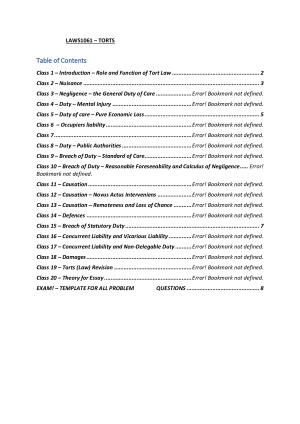 This set of notes includes ALL readings notes, cases and a personalised template for the final exam. It is compiled using a hyperlinked table of contents for easy use. This is a really enjoyable course with a lot of content so using a complete set of notes will always help. I achieved a HD with a mark of 90 in this course with Dr Jennifer Moore as my lecturer. List of Topics: - Nuisance - Negligence - general duty of care - Duty - Mental injury - Duty - Pure economic loss - Occupiers liability - Duty - Public authorities - Breach of Duty - Standard of Care - Breach of Duty - Reasonable foreseeability and calculus of negligence - Causation - Causation - Novus Actus Interveniens - Causation - Remoteness and Loss of Chance - Defences - Breach of Statutory Duty - Concurrent Liability, Vicarious Liability, Non-Delegable Liability - Damages - Theory (FOR ESSAY)