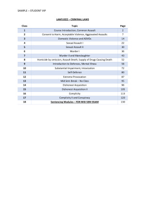 Full LAWS1022 notes including ALL CASES and sentencing module needed for mid semester assignment (bottom of the document and sample included). 139 pages and excellent for following along in class. I achieved a HD with a mark of 91 and my lecturer was Helen Gibbons. I really enjoyed this course and i hope you do too :). List of Topics: - Common Assault - Sexual Assault - Homicide - Defences - Dishonest Acquisition - Complicity and Conspiracy - Sentencing (FOR MID TERM ASSESSMENT)