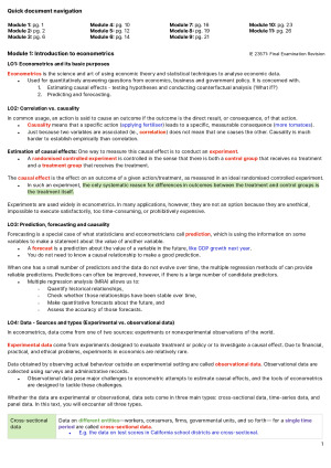 This is a complete summary of the Introductory Econometrics (IE) course. It includes notes from lecture slides and the textbook, and each module has generally been condensed into one double-sided A4 paper (2 pages), although some may be a little longer. This document covers ALL modules: - Module 1: Introduction to econometrics - Module 2: Review of probability - Module 2: Review of statistics - Module 4: Linear regression with one regressor - Module 5: Linear regression with one regressor - Hypothesis testing and confidence intervals - Module 6: Linear regression with one regressor - Generalisations - Module 7: Linear regression with multiple regressors - Module 8: Linear regression with multiple regressors - Hypothesis testing and confidence intervals - Module 9: Linear regression with multiple regressors - Generalisations - Module 10: Assessing studies based on multiple regression - Module 11: Qualitative response models - Regression with a binary dependent variable These notes have been formatted according to the following key: - Red: Definitions - Royal blue: Examples - Purple: Equations - Turquoise: 'Rules' or notation - Highlighting is generally used to visually divide concepts when they are a part of a larger concept, or to more easily distinguish steps in a process.