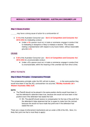 These notes are what I used in last years end of semester exam. They are structured as a checklist but with cases added in and steps for going through each type of remedy. They include the exam topics which were: MODULE 4: COMPENSATORY REMEDIES - AUSTRALIAN CONSUMER LAW MODULE 5: EQUITABLE REMEDIES - EQUITABLE COMPENSATION MODULE 6: GAIN-BASED REMEDIES (equitable) (Gain as opposed to loss) MODULE 7: RESTITUTION: MODULE 8: VINDICATORY REMEDIES: MODULE 9: COERCIVE REMEDIES: I ended up with a HD in this subject and the only thing I used were these notes - no additional case summaries or books. Good luck :)