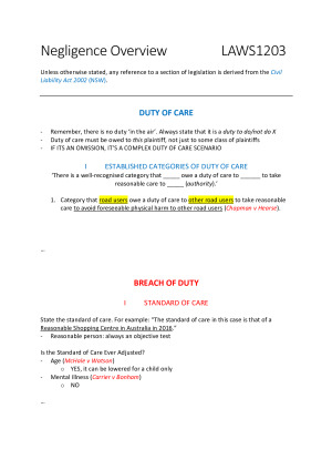 Extensive and extremely detailed notes of entire Negligence section of Torts course. These are the only notes I used to get an HD on my Torts Final Exam. Key Features: - Complete and holistic overview of 5 main areas of Negligence. - Step by step explanations of legal (statutory and common law) tests. - Numerous cases and statutes. provided as authorities for every section of Negligence, with the most important cases' facts summarised. Cases are referred to by their short titles, so you can easily cite them in exam responses. - Explanations and examples are provided throughout so you can understand how to apply the concepts to any scenario. - Suggestions on how to structure and frame your responses with example sentences. - Overview follows the structure and order a response should be written - Cases and legislation are displayed in different colours so you can easily find a relevant authority to cite AREAS COVERED: Duty of Care - Established categories of Duty of Care - Simple cases of Duty of Care - Complex cases of Duty of Care (incl. salient features, special DOC situations, special kinds of harm and special 'no duty' situations) Breach of duty - Standard of Care - Particularising Plaintiff's Claims - Two Part Breach test ( and ) Causation - Factual/Necessary Condition Causation - Legal Causation (incl. common law test of remoteness, and 'new intervening acts') Defences - Contributory Negligence - Voluntary Assumption of Risk Vicarious Liability - Three part test (Defendant at fault, Sufficient relationship, Sufficient connection) Please take note that these notes reflect my understanding of the course at the time it was taught to me. I cannot guarantee their accuracy and cannot speak to what areas are included on the current LAWS1203 exam. Use this overview alongside your own notes, readings and lectures to ensure your understanding is correct and complete. Do not copy any part of these notes word-for-word in any assessment response, as that may constitute plagiarism. Please also note the StudentVIP terms and conditions as to the following: "The Buyer shall not duplicate, disseminate or publicly display any Notes purchased via StudentVIP Notes. Individual duplicates ( copies and printouts of the Notes), may only be made for private individual, personal use, and on the terms outlined in section 40 of the Copyright Act – Fair dealing for purpose of research or study."