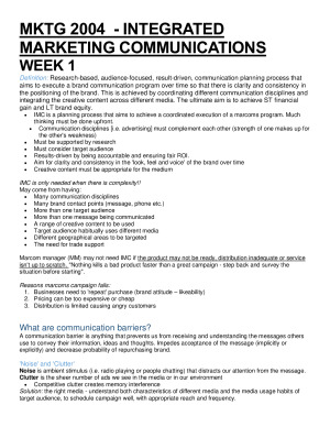 Textbook notes and lecture notes from Week 1 - 12 W1: Defining IMC W2: Generating Consumer Insights W3: Brand Positioning W4: Media planning & Budgeting in advertising W5: Traditional and Digital Media W6: Advertising Creatively W7: Planning and executing the creative appeal W8: Social Influence W9: Public Relations, Corporate reputation and sponsorship W10: Influence in Personal Selling W11 & 12: Direct Marketing and Sales Promotion