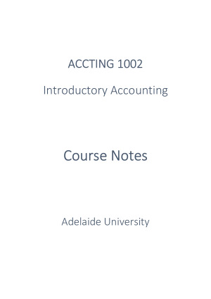 Comprehensive 57 page Introductory Accounting 'Distinction' course notes. Notes have been created using the textbook, course readings, lectures, and tutorials. Topics include: - Introduction to Financial Accounting. - Financial Statements. - Recording Accounting Transactions. - Financial Statement Analysis. - Introduction to Management Accounting. - Nature of Costs and Product Cost. - Performance Management. - Budgeting.
