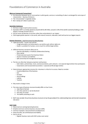 Comprehensive 76 page Commercial Transactions 'Distinction' course notes. Notes have been created using the textbook, course readings, cases, lectures, and seminars. Topics include: - Foundations of Commerce in Australia. - Introduction to Contracts and their Regulation. - Commercial Leases. - Guarantee & Insurance. - Sale of Goods. - Personal Property. - Personal Property Securities. - Competition & Consumer Law. - Electronic Commerce. - Tax. - International Commercial Contracts.