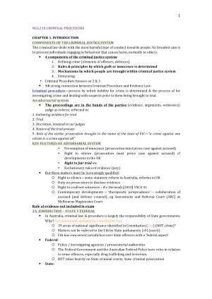 These are the notes I wrote myself and used in the exam to receive an 86 HD overall for MLL218 Criminal Procedure. This was a great exam for me, and these notes really helped me pull out the right law quickly and produce HD-level analysis. I hope these notes help you get the grades you desire. These notes cover the following topics: - Search of a Person and their Possessions - Forensic Procedure > Non-Voluntary Forensic Procedure > DNA Samples > Fingerprinting - Police Questioning > Silence and Privilege Against Self-Incrimination > Questioning in Police Custody > Admissions - Identification Evidence > Visual Identification Evidence > Picture Identification Evidence - Commencement of Criminal Proceedings > Arrest > Commencing Trial - Committal Procedure for Indictable Offences - Jury Selection