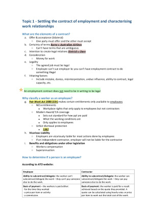 Topics included: 1. Settling the contract of employment and characterising work relationships 2. The employment contract and implied terms 3. Incorporation of Terms 4. Origins & features of Australian employment, Labour and Industrial Law 5. Intro to Australia's Industrial Relations System 6. EA's and Bargaining 7. Termination