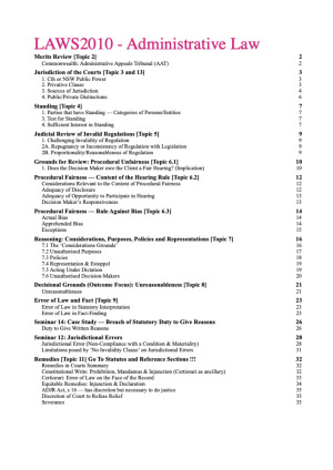 Finding admin law difficult? Cases are too long? Want to save time? These are the notes for you. These are a highly comprehensive set of administrative law notes that I have refined and revised multiple times to contain the key information that you need in this course in just 35 pages (34 pages excluding the tables of contents). I achieved one of the top marks in my cohort with a HD in this unit. Feel free to message me on SVIP for a copy of my academic transcript to guarantee this mark. There are pinpoints included and all the notes are structured in a scaffold format so that you can easily progress through problem questions. Key principles are shown in light blue, legislation in dark blue, cases in purple, important things either red or bolded. This is well worth the investment (premium notes deserve premium value) and all the topics have been structured into a scaffold response according to how you should answer the problem question. Other notes are way too convoluted and contain too much unnecessary information. ✓ Succinct information ✓ Comprehensive ✓ Colour-coded for easy reading ✓ Pin-point referencing Get these notes now and help yourself in law school :) Topics include 1. Merits Review 2. Jurisdiction of the Courts / Privative Clause 3. Standing 4. Judicial Review of Invalid Regulations 5. Procedural Unfairness (Implication, Content, Bias) 6. Consideration, Purposes, Policies and Representation 7. Unreasonableness 8. Error of Law and Fact 9. Case Study - Breach of Statutory Duty to Give Reasons 10. Jurisdictional Errors 11. Remedies
