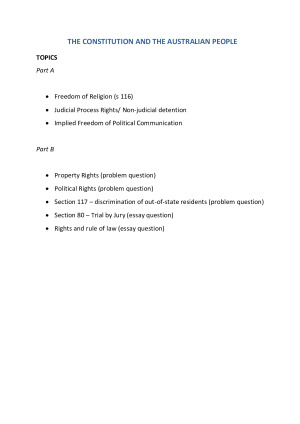 These are extensive and comprehensive exam notes for LLAW2221 - The Constitution and the Australian People. I note that although the curriculum at Flinders has now changed, this topic covered a substantial amount of the content in the new Constitutional Law topic and therefore would still be very helpful in combination with the notes from LLAW2212 The Constitution and the Australian Federation. Areas covered: Part A • Freedom of Religion (s 116) • Judicial Process Rights/ Non-judicial detention • Implied Freedom of Political Communication Part B • Property Rights (problem question) • Political Rights (problem question) • Section 117 – discrimination of out-of-state residents (problem question) • Section 80 – Trial by Jury (essay question) • Rights and rule of law (essay question) These notes are colour-coded and have a cohesive flow. They break down the topics and are structured in a way to enable you to tackle any exam question on that topic. It includes case summaries and many different examples. It also provides some prompts that may assist you in applying the legal principles to the facts before you. I achieved a HD for this exam and can attribute the grade to these notes. It is recommended that you use these notes as the basis for your own exam notes.