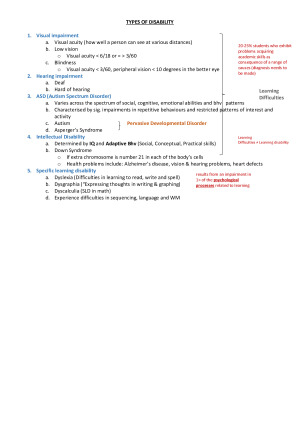 These notes include easy-to-read and all-important terms required for the exam. These notes include a separate section for ALL statistics for easy reference, strategies for each topic synthesised into an essay format to make it simpler to remember, understand and APPLY during your exam. Notes are colour coded. The topics included are: - Vision impairment - Hearing impairment - Autism Spectrum Disorder - Intellectual Disability - Specific Learning Disability (Dyslexia) - Principles and Challenge of Inclusion - The Universal Designed Inclusive Classroom (UDL) - Legislation and Policies - Strategies for engaging in meaningful collaboration with parents, caregivers & professionals - Classroom - Behaviour and its Influences (An Ecology Perspective) - Preventative Classroom Management (4 Essential Components)