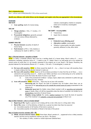 Topics: - Homicide (causing death by an intentional act of violence, murder, manslaughter) - Causing Harm (causing serious harm, causing harm, assault) - Attempts - Self-Defence (defence of people, defence of property) - Mental Impairment - Strategic Considerations Step-by-step process, exam skeleton notes. 2020 exam grade: 92