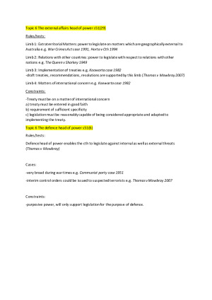 Topics Covered: Topic 2: State Constitutions Topic 3: Constitutional Division of Power between Commonwealth & States Topic 4: Intergovernmental Immunities Topic 5: Characterisation Topic 6: The External Affairs Head of Power s51(29) Topic 7: The Defence Head of Power s51(6) Topic 8: s92 and s90