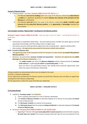 These are comprehensive, color coded notes for all 13 weeks of content. All cases (including detailed summaries) and statutes learnt are included. These notes would make studying so much easier for you, not a single bit is missing from the course content!! It is a helpful summary of all lectures & seminars, detailing several step-by-step processes to answer problem questions as well as theory needed for essay questions. Much of the notes include verbal content spoken by the lecturer and they have been crucial to answering many exam questions. Topics include: Fidcuiary Duties I & II, Confidential Information, Constructive Trusts, Resulting Trusts I & II, Trustees I, II & III, Remedies I & II, and a review of the whole course. Important takeaway from the cases & ratio decidendi all highlighted. The structure is set out very clearly and I have received feedback that the notes are extremely helpful for exam preparation! In the sample notes, part of the notes for Fidcuiary Duties I & II, Confidential Information, Constructive Trusts, Resulting Trusts I, Trustees I, Remedies I & II have been included. *Note that each week's notes has been majorly shortened to just provide you with an idea of the structure.