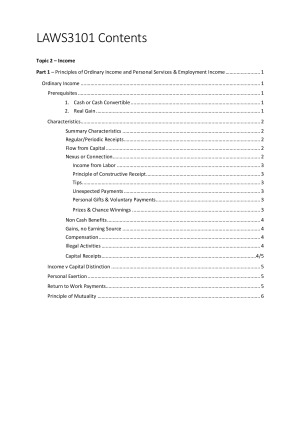 This is a comprehensive compilation of notes for the University of Queensland's LAWS3101 (Income Tax Law) subject. These notes were created by synthesising textbook readings, lecture notes and additional in-lecture explanations. They would be of great assistance for both study purposes and particularly useful in the final exam. The notes were primarily written to enable the quick and easy application of the ILAC answer format during the final exam. In total the notes are 114 pages broken down into 8 sections based on each main topic / body of Law covered in the course, these being; 1. Residence & Source, 2. Income (2 parts), 3. Capital Gains Tax (CGT), 4. Deductions, 5. Income Tax Accounting & Trading Stock, 6. The Tax Assessment, 7. Goods & Services Tax (GST), 8. Fringe Benefits Tax (FBT). There is also a table of contents included for quick navigation of the notes during the final exam. In order to permit the quick and easy application of the ILAC answer format during the final exam each section is structured into 3 columns, these being: - "Sub Topic": (for navigation purposes): States main body of law within particular section (e.g. Within 'Income' headings include; Ordinary Income, Prerequisites, Characteristics, etc.) - "Notes": Essentially provides the "Law" section that would be included within a standard ILAC answer, including relevant definitions, section numbers, cases and other useful information. - "Legislation / Case": Provides the name of cases/legislation that are applicable and should be considered for each Area/Sub-Area of law with a small explanation of what the case relates to. E.g. Within 'Income': "[FCT v Cooke and Sherden] – Soft drink sellers, holiday nontransferable = not cash convertible" or "[Hochstrasser v Mayes] – Taxpayer compensated by employer for loss on work related sale of home. (not real gain; compensated for a work-related expense)." (See sample notes for a better understanding) During the final exam - with the assistance of this information - a student need only read the question, determine the apparent issue (Issue). Using the included table of contents, find within these notes the area of law that is applicable, navigate to this section and write down the applicable law from the "Law" column including the name of applicable cases/legislation found directly across in the "Cases/Legislation" column (Law). And then continue, using the information stated in the Law section taken from these notes, apply the facts of the situation to the law (Application) and draw a conclusion (Conclusion), producing a high quality ILAC answer.