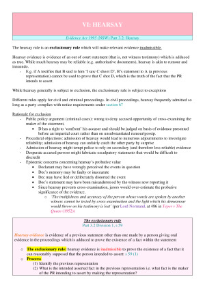 These are full course evidence notes including all the legislation (highlighted so you don’t have to read through it all!) and cases. The key principles and important information are in coloured textbooks to summarise and make sure you remember the crucial points. I made the notes using all the readings, other notes and my own external reading. Topics included: - Introduction to evidence law - Proof: part I - Adversarial trial - Adducing evidence: witnesses, documents and real evidence - Admissibility of evidence: relevance - Hearsay - Credibility - Tendency & coincidence evidence - Character of the accused - Opinion evidence - Identification evidence - Discretions - Admissions and self-incrimination - Proof - part II NB: sample not in order