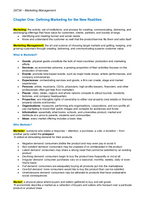 EXTENSIVE DETAILS AND HIGH QUALITY NOTES! Marketing Management Textbook Notes that are a high level summary of every chapter covered in the subject. Very easy to follow yet provide great understanding of all topics within the textbook. Distinction level notes for the following chapters: 1 - Defining Marketing for the New Realities 2 - Developing Marketing Strategies 3 - Collecting Information and Forecasting Demand 4 - Conducting Marketing Research 5 - Creating Long-Term Loyalty Relationships 6 - Analysing Consumer Markets 7 - Analysing Business Markets 8 - Tapping into Global Markets 9 - Identifying Market Segments and Targets 10 - Crafting the Brand Positioning 11 - Creating Brand Equity 12 - Addressing Competition and Driving Growth 13 - Setting Product Strategy 14 - Designing and Managing Servies 15 - Introducing New Market Offerings 16 - Developing Pricing Strategies and Programs 17 - Designing and Managing Integrated Marketing Channels 18 - Managing Retailing, Wholesaling and Logistics 19 - Designing and Managing Integrated Marketing Communications 20 - Managing Mass Communication 21 - Managing Digital Communications - Online, Social Media and Mobile 22 - Managing Personal Communications - Direct and Database Marketing and Personal Selling 23 - Managing Holistic Marketing Organisation for the Long Run
