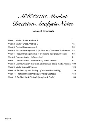A comprehensive and detailed set of HD notes that explains all content from the lectures and readings with additional examples and diagrams. These notes are formatted through headings and sub-headings that make the notes very easy to follow and understand. I received a HD (91) using these notes. NB: These are notes from the equivalent Market Decision Analysis (MKC2130) at Monash University Clayton Campus for which the same content is taught. Topic List: Week 1: Market Share Analysis 1 Week 2: Market Share Analysis 2 Week 3: Product Management 1 Week 4: Product Management 2 (Utilities and Consumer Preference) Week 5: Product Management 3 (Forecasting new product sales) Week 6: Communication 1: Promotion Week 7: Communication 2: Advertising media metrics Week 8: Communication 3: Online advertising & social media metrics Week 9: Marketing and Finance Week 10: Profitability and Pricing 1 (Customer Profitability) Week 11: Profitability and Pricing 2 (Pricing Strategy) Week 12: Profitability & Pricing 3 (Margins & Profits)