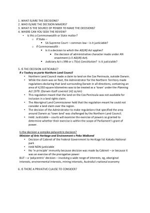 I finished this subject in Sem 2 2020 with a Distinction grade. I have set out the notes in a step-by step checklist format essential for the purpose of answering exam questions for Judicial Review. Judicial Review is a huge topic as it covers multiple grounds of review that you need to consider in answering exam problem questions. This topic forms the bulk of the entire course and involves multiple questions in the exam. Within the notes, I have inserted summaries for case laws useful for application in the problem questions which will save you so much time doing the research. These notes have covered all the content you need to know for Judicial Review and you can use it directly for exam. My notes cover the steps as follow: - What is/are the decisions? - Who is/are the decision makers? - What is the source of power to make the decisions? - Where can you seek the review? - Is the decision justiciable? - Is there a privative clause to consider? - Who is seeking review? Do they have standing? - What grounds of review will you argue?