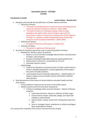 Complete summary of the Health in the 21st Century lecture content! These notes contain comprehensive summaries of each lecture and kuracloud module given in HLTH1001, organised under the learning objectives of each lecture. These notes are designed to be a detailed and digestible summary of the course which can be used for general revision or as a starting point for further summarisation. The topics covered include: 1. Introduction to health 2. Antibiotic resistance 3. Burden of disease 4. Social determinants of health and chronic illness 5. Infectious disease and global health 6. Indigenous health 7. Migration and Health 8. Health technologies 9. Rural health 10. Health systems 11. Theories, health policy and ethics 12. Sociological theories These notes are also available as only the reading summaries or as a complete bundle with all reading summaries under each topic heading :)