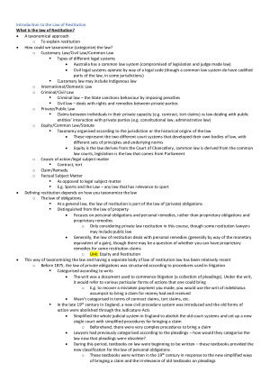 Detailed notes of the entire course NOT an exam summary. Scored a 85+ in the course overall. Includes: Introduction to the Law of Restitution Mistaken Payment Claim Defences in Restitution Law Coercion Theories of Private Law and Unjust Enrichment Theory Relationship of Equity and Restitution Ineffective Contracts Necessitous Intervention