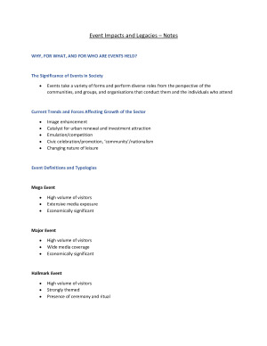 A full semester of notes. Topics: WHY, FOR WHAT, AND FOR WHO ARE EVENTS HELD? The Significance of Events in Society Current Trends and Forces Affecting Growth of the Sector Event Definitions and Typologies Impact and Legacy Dimensions Overview THE RELEVANCE OF EVENT EVALUATION Relevance of Event Evaluation STAKEHOLDER THEORY Primary Event Stakeholders Secondary Event Stakeholders Approaches to Engaging with Stakeholders Benefits of Stakeholder Engagement Attributes Triple Bottom Line POLITICAL DIMENSIONS OF EVENTS Justifications for Government Involvement in Events Public Good Event Justified Involvement based on Intangible Benefits Political Roles for Events Enhance the Personal Political Ambitions/Profile of Individuals Forms of Government Involvement in Events Event Funding Criteria Issues Associated with Events and the Political Context Politics of Sport Mega-Events The Politics of Hallmark Events EVENTS AND TOURISM Uses and Outcomes of Event Tourism The Event Tourism Strategy Process Niagara’s Tourism Industry ECONOMIC DIMENSION OF EVENTS Who is Interested in Economic Impacts and Why? How are the Results of Economic Evaluations Used? The Economic Impact of an Event Issues with Economic Impact Evaluation Setting the Boundaries of the Host Region for the Event Determinants of Inscope Expenditure Classifying Inclusions and Exclusions of Inscope Expenditure The Measurement Process – Direct Inscope Expenditure Inscope Expenditure as an Input to Economic Impact Studies Total Effect Economic (Multiplier) Models SOCIAL DIMENSION OF EVENTS Positive Social Impacts Negative Social Impacts Social Impacts Small’s (2007) Six Social Impact Dimensions Measuring Social Impacts Extrinsic Factors Intrinsic Factors Measurement Tools Social Impact Perception (SIP) Cluster Analysis Rockford Music Festival ENVIRONMENTAL IMPACTS The Sustainability Sell-in The Industry, Suppliers and Contractors Sustainability Policy The Carbon Issue Carbon Offsetting The Drivers for Action Positive Environmental Impacts Positive Environmental Impacts Green Guidelines – Waste Green Guidelines – Water Green Guidelines – Energy Green Guidelines – Transport Measuring Environmental Impacts Environmental Policies Contracts and Sustainable Purchasing Benefits of Greening your Event International Standards Organisation 20121 Implications SPORT EVENTS AND LEGACY Defining Legacy Dimensions of Legacy Valuation of a ‘net’ mega-event legacy Legacies of an event that are supplementary to the long-term development plan of the city Obstacles Considerations of Legacy Legacy Opportunities Potential Negative Legacies Legacy as a Justification for Government Involvement in Events Strategic Approach to Long-term Outcomes Bottom-up Approach to Measuring Legacy Potential Pitfalls of Legacy Planning Implication BUSINESS EVENTS AND LEGACY Business Events Sydney Traditional Valuation of Business Events Beyond Tourism Benefits Initial Research The Findings – Broader Contributions of Business Events Business Event Exhibitors Research Impacts and Lessons Learned