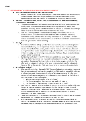 Comprehensive, summarised scaffolds/ approach to problem questions prepared for 2021 Contracts Final Exam (second half of course content examinable only). Includes step by step approach to problem questions for Topics 7-12 alongside all the key principles/rules of relevant case law you will need to know. TOPICS COVERED: - Topic 7: Terms - Topic 8: Construction - Topic 9: Exclusion Clauses & Privity - Topic 10: Discharge by Performance, Agreement or Failure of a Contingent Condition - Topic 11: Discharge for Breach or Repudiation - Topic 12: Process and Effect of Termination, Discharge by Frustration