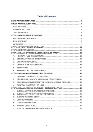 HD Comprehensive Evidence Exam Notes! Notes go through step by step how to answer an evidence exam question. Topics Covered: - Exam Answer Templates - Proof & Presumptions - Step 1: How to Adduce Evidence - Step 2: Is the Evidence Relevant? - Step 3: Is it Privileged? - Step 4: Do any Exclusionary Rules Apply? - Step 5: Do any Discretionary Rules Apply? - Step 6: Do any Judicial Warnings/Comments Apply?