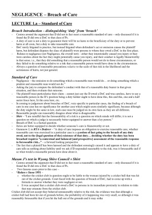 Highly detailed compiled lecture, readings and case notes for Breach section of Torts LAWS1203 ANU course. Content included: - Standard of Care - Breach Introduction – distinguishing ‘duty’ from ‘breach’ - Mason J’s test in Wyong Shire Council v Shirt - Civil Liability Act 2002 NSW - Cases and the Act – - Standard of Care – obvious risks - Introduction to the ‘Reasonable Person’ Introduction Cases included: (* cases = compulsory cases) - Wyong Shire Council v Shirt (1980) 146 CLR 40. - *Roads and Traffic Authority of NSW (RTA) v Dederer (2007) 234 CLR 330. - *Bolton v Stone [1951] AC 850. - Paris v Stepney Borough Council [1951] AC 367. - *Graham Barclay Oysters Pty Ltd v Ryan (2002) 211 CLR 540. - *Vairy v Wyong Shire Council (2005) 223 CLR 422. - *E v Australian Red Cross Society (1991) 27 FCR 310. - *McHale v Watson (1966) 115 CLR 199. - *Imbree v McNeilly (2008) 236 CLR 510