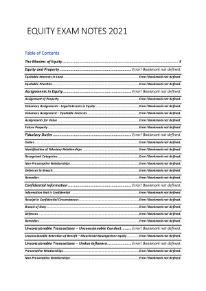 Hi fellow Law students! I completed Equity in Semester 1, 2021, and received a Distinction overall. These notes include class notes, and external sources that I verified personally, as well as extensive readings from the textbook "Equity and Trusts" (4th ed.) LexisNexis Butterworths. They are incredibly comprehensive on the following topics in Equity: - Equitable Maxims - Equity and Property - Assignments in Equity - Fiduciary Duties/Relationships - Confidential Information - Unconscionable Conduct - Undue Influence - Estoppel - Equitable Defences - Equitable Remedies All relevant important cases are highlighted, as well as some important topics that may be hidden otherwise. These notes saved my life during the exam, so I recommend these!