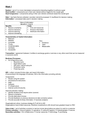 Full summarised notes for the complete Accounting Information Systems course - covering lectures, textbook readings, other readings and tutorials. I finished this subject in Semester 1, 2019 with a 87 HD Grade. TOPICS: Week 1 - Accounting information systems: an overview - Transaction processing and enterprise resource planning systems - Reading: textbook chapters 1 & 2 Week 2 - Systems documentation techniques - Relational databases - Reading: textbook chapter 3 Week 3 - Fraud, computer fraud and abuse techniques - Reading: textbook chapters 5 & 6 Weeks 4 & 5 - Control and accounting information systems - Controls for security, confidentiality, privacy, processing integrity and availability - Reading: textbook chapters 7, 8, 9 & 10 Week 6 - Auditing computer-based information systems - Reading: textbook chapter 11 Week 7 - Accounting information system applications (transaction cycles) - Reading: textbook chapters 12 & 13 Weeks 8 & 9 - Systems developments process - Reading: textbook chapters 20, 21 & 22 Week 10 - Database design and implementation using REA model - Reading: textbook chapters 4 & 17 Week 11 - XBRL reporting - Reading: Considine et al chapter 5