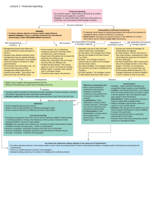 Useful, yet concise mind map that summarize lecture notes, notes taken during lecture and recommended readings. It also includes useful examples that help to understand the content better. I used this lecture notes and tutorial to do revision for mid semester test and final exam. I received 90% in both mid semester test and final exam. Hope this lecture notes can help you to improve your understanding and achieve H1! Topic covered: (1) Financial reporting (2) Recognition (3) Measurement (4) Income (5) Ratio Analysis (6) Valuation (Dividend discount model & Residual income model) (7) Valuation (Discounted free cash flow model & Multiples) (8) Earnings management (9) Efficient capital market (10) Executive compensation (11) Disclosure and regulation (12) Formula