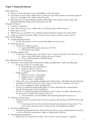 Detailed set of notes to help you achieve an H1. Scored 96/100 on the final exam. Important formulas are highlighted in yellow for easy access during the exam :) Topics: - The Financial System - Financial Regulatory Authorities - Primary Markets - Secondary Markets - Investment Funds - Money Markets, Bond Markets, Derivative Markets and Foreign Exchange Markets - Banking and Insurance Good luck with that elusive H1!