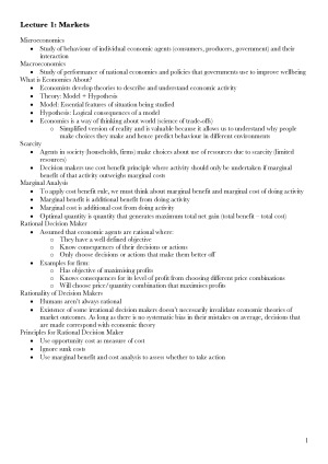 Detailed set of notes to help you achieve an H1. Important formulas are highlighted in yellow for easy access during midterms and exams :) Topics: - Markets - Consumption and Investment Under Certainty - Choice Under Uncertainty - Mean-Variance Portfolio Theory and CAPM - Game Theory I - Game Theory II - Bank Runs - Economics of Information - Adverse Selection - GDP and Economic Growth - Business Cycles - Inflation Good luck with that elusive H1!