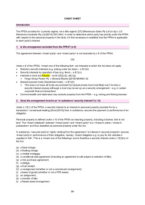I received a mark of 84 in IPCL. These notes are the notes I prepared for and used in the final exam of Spring 2020. They were made for the new and revised UTS course. Notes prior to this time would be outdated. The hardest topic on the PPSA has the in-depth Cheat Sheet I created which was lifesaving. The notes are extremely comprehensive and cover all topics examined in the course including: 1 - Introduction to commercial law and the history of, and distinction between, common law and equity 2 - What is property? Real and personal property, legal and equitable property 3 - Equitable interests and trusts – How are trusts used in a commercial context? 4 - Principles of statutory interpretation 5 - Sale of Goods Act (Part 1) 6 - Sale of Goods Act (Part 2) 7 - Overview of the Australian Consumer Law 8 - Australian Consumer Law (Part 2) 9 - Bailment and Financing Transactions 10 - Personal Property Securities Act (Part 1) 11 - Personal Property Securities Act (Part 2) 12 - Personal Property Securities Act (Part 3) The sample I've provided is taken from various parts including part of my PPSA Cheat Sheet, as well as my notes on the ACL.