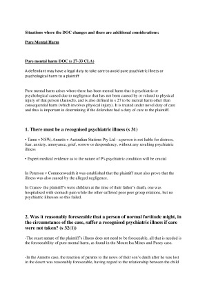 All readings and weeks (1-13) are covered. The following topics are covered (which include every single topic, even those that do not have a dedicated lecture, or a dedicated tutorial): -What is tort? -Perspectives on tort law -Introduction to trespass and case -Battery -Assault -Action on the case for wilful injury -False imprisonment -Actions involving people -Nuisance -Trespass to land -Trespass to goods -Conversion -Detinue -Actions involving land -Actions involving good -Introduction to negligence -Introduction to duty of care -Duty of care -Duty of care: Established & novel categories -Pure economic loss -Pure mental harm -Standard of care -Statutory authorities -Factual causation -Scope of liability -Causation / Scope of liability -Particular duty areas -Vicarious liability, Non-delegable duties -Defences -Intoxication These notes allowed me to get a HD in this subject, and are extremely beneficial for both the assignment and the exam. I also present the information in an easy to understand format. You could realistically use these notes instead of the textbook, as they contain all relevant information you could ever need to perform well in LLB 240.